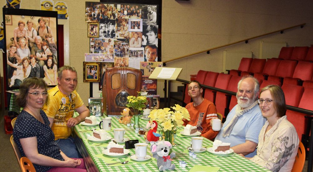 Am Samstag, den 25. Juni trafen wir uns ganz familiär im Schleizer Kino zu unserem dritten deutschen Walton Fantreffen. Katja alias Mary Ellen vom ersten Fantreffen, Uli und Christiane vom zweiten Fantreffen, sowie Neuling Patrick zählten zu meinen Gästen. Wir waren zwar nur fünf Leute aber dafür war es wieder sehr schön. Um 14 Uhr schauten wir uns die Folge "John-Boy und die große Stadt" auf großer Kinoleinwand an. | ||
