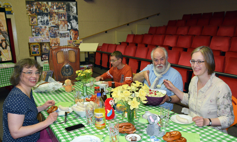 Nun erfreuten wir uns einer Lesung der von ihm selbst geschriebenen Waltons Geschichte von Uli: "Briefe aus Waltons Mountain" Wir schlossen die Augen und stellten uns Ulis Reise nach Waltons Mountain live und persönlich vor. Als Uli eine Pause machte wollte Patrick jetzt etwas Anderes tun. Aber alle anderen wünschten sich das er weiter liest. Nach einiger Zeit des gespannten Zuhörens brach Uli ab und sagte "Abendbrot Pause". Wichtig für und was das Wort Pause!!! Also liest Uli weiter… Dies hatte er beim vorletzten Fantreffen damals leider nicht getan. Selbst Uli war von seinen eigenen Zeilen angetan. Alle gingen mit nach hinten und halfen mit das Abendbrot vorzubereiten. Es gab "Mutters selbst gemachter Kartoffelsalat mit frischen original bayrischen Weißwürsten mit süßem Senf, Brezeln und bayrisches Bier sowie Tee. Nachdem wir uns alle dick und rund gefuttert hatten, übrigens es schmeckte allen köstlich, las Uli weiter seine Geschichte zum Schluss. Wow, war das wieder interessant. Auch Patrick war nun vom Vorleser und seiner eigenen Geschichte angetan. | ||
