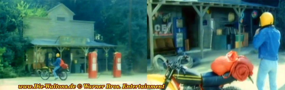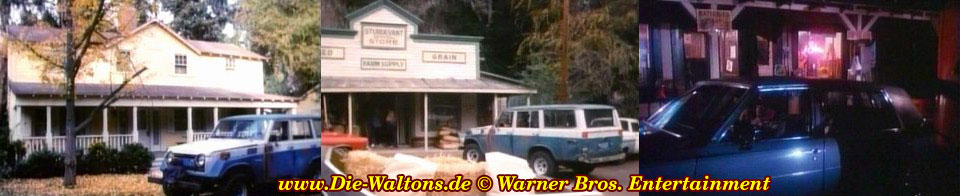 ![]() Das Walton-Haus wurde mit modifiziertem Dach als Lucas Crosbys (Special Guest Star Geoffrey Lewis) Haus 1984 in Falcon Crest genutzt; hier ein Bildmitschnitt aus Folge 64. (Bild Links) Das Set von Ike Godsey’s Store tauchte 1982 in Folge 18 als Cold Duck (Kneipe; leider ohne Foto) und 1984 in Folge 61 als Tankstelle sowie in Folge 63 als Laden auf. (Bildmitte und Bild rechts) Danke Thomas | ||