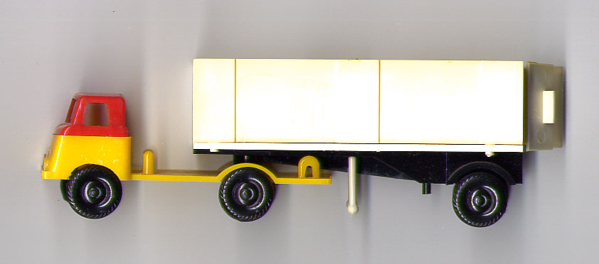 | DDR LKW mit Anhänger aus der Serie "Der kleine Grossblockbaumeister" Oben klebt ein Preisschild "EVP 2,00 M" Das Fahrzeug ist beweglich und die Türen lassen sich hinten öffnen. Fhrzeug ist zerlegbar. Die Metallstangen an den Radsätzen sind leicht angerostet. |