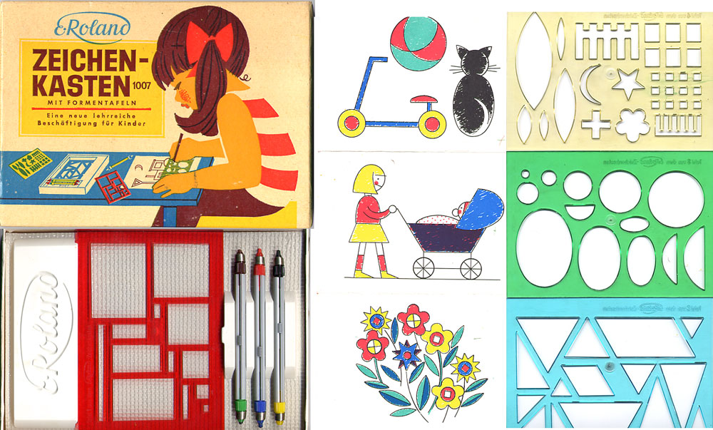 | Original DDR E. Roland Zeichenkasten mit Formentafeln Das Bild ist eine Montage. So sieht man den ganzen Inhalt. Die Tafeln sind vollständig in Ordnung. Der gelbe Stift müsste mit einer normalen Buntstiftmiene nachgefüllt werden. |