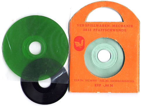 | Grosse Schallplatte für Juniorfon Lachsack und Sprechpuppe. Art.-Nr. 1102 Kleine weisse Friedenstaube ... B-Seite Über allen strahlt die Sonne Inclusive original Verpackung. Zum Staubschutz von Sammler eingeschweisst + 2 Minischallplatten ohne Bezeichnung |