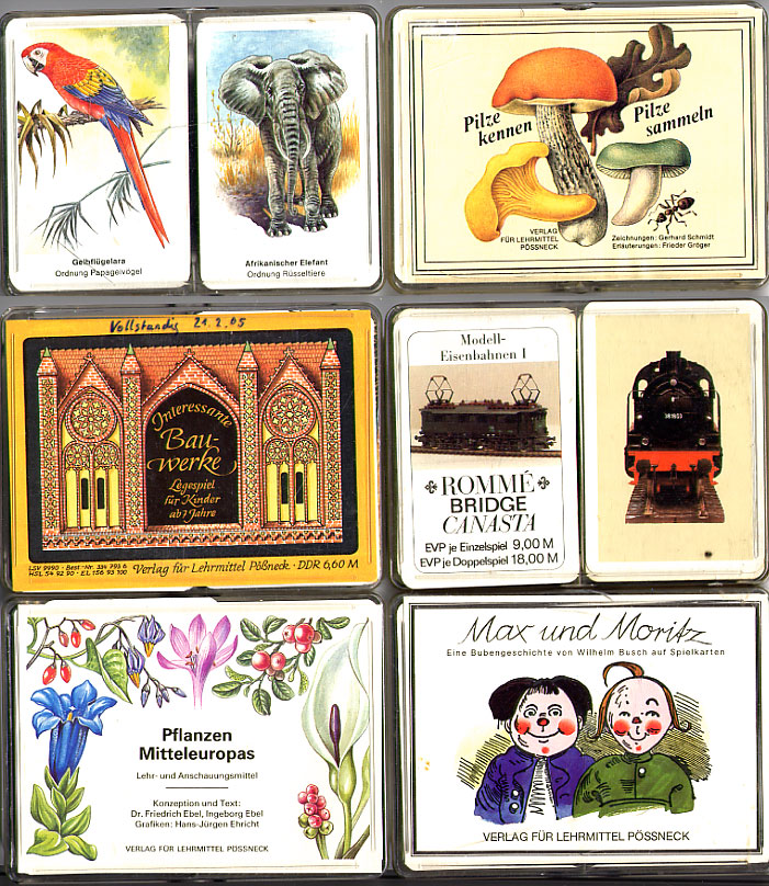 6 original DDR Kartenspiele: Interessante Bauwerke (Aus der DDR) Legespiel Pilze kennen - Pilze sammeln Pflanzen Mitteleuropas - Lehr und Anschaungsmittel (Je Karte ein Tier mit genauer Erklärung) Tiere Mitteleuropas - Lehr und Anschaungsmittel (Je Karte ein Tier mit genauer Erklärung) Romme Spiel "Modelleisenbahnen" Max und Moritz alle Bubengeschichten auf Spielkarten |