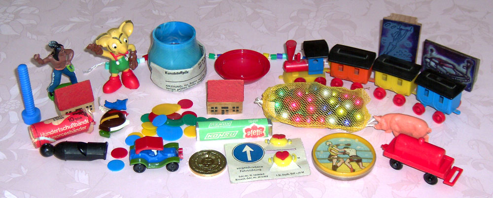 | DDR Indianer, DDR Maus, Das Flohspiel im Kunststoffpilz, Kindereisenbahn, Stempel (Auto und Artistin), Hundertschußbänder für Zündplätzchenpistole, 2 Holzhäuser, 1 SacK Murmeln OVP, 2 Zopfhalter, Kugelspiel, DDR Gold-Medallie mir DDR Wappen, Elastolin Schwein, Auto, zerlegbare Figur, KONSÜ Pfeffi. |