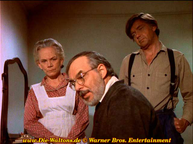 | Szenenwechsel: Wieder im Schlafzimmer. John sitzt im Sessel und schaut auf die schlafende Olivia. John-Boy öffnet leise die Tür und schaut hinein. John legt den Finger vor den Mund und geht hinaus | ||