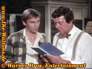 (Jason) John-Boy, ich verdiene doch jetzt. Kann ich Dir nicht wegen der Bücher helfen? (John-Boy) Danke Jason, aber das mache ich allein. (Jason) Wenn Du es nicht schaffst, helfe ich Dir. (John-Boy) Nein! Aber vielen Dank. (Jsaon) John-Boy. (John-Boy) Ja. (Jason) Ich bin doch froh, dass Du es ablehnst. (John-Boy lacht) 'Nacht, Jason. (Jason) 'Nacht, John-Boy. |