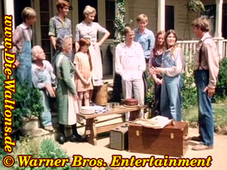 Erin schreit. (Olivia) Erin, was ist los ? (Erin) Da ist eine Grille in meinem Bett, eine ganz große. (Olivia) Jim-Bob, hast Du die da reingetan ? (Erin) Jim-Bob !? Großvater Sam lacht. (Jim-Bob) Großvater war's. (Sam) Ja. (Elizabeth) Mary-Ellen, ich würde gerne mit auf die Schwesternschule gehen. (Erin) Auja, dann hätt' ich das Zimmer für mich allein. (John) Hört endlich auf zu quasseln und schlaft. (Erin) Das zahl' ich Dir heim, Großvater. Großvater Sam lacht. | ||