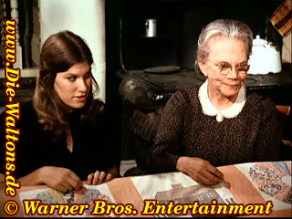 (Elizabeth) Erzähl' mir vom Kino, Jim-Bob. (Jim-Bob) Morgen, Elizabeth. Wir haben uns den Film dreimal angesehen. Gute Nacht. (Erin) Mama, wann ist denn meine Quilt-Party ? (Mary Ellen) Gute Nacht, Großmutter. (Ester) Gute Nacht, Mary Ellen. (Erin) Mama, wann ist denn meine Party ? (John) Darüber reden wir morgen, Erin. Gute Nacht. (Ben) Mama, im Kino war ein Mädchen, das hat wie Du ausgesehen. (Olivia) Das freut mich, Ben. Gute Nacht. | ||