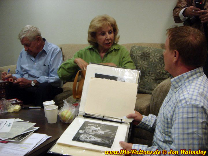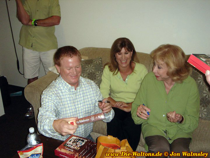 Ben Walton (Eric Scott), Mary Ellen Walton (Judy Norton-Taylor) und Olivia Walton (Michael Learned) signieren die erste Walton Staffel auf DVD.